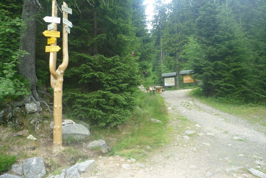 V levo Szrenica, v pravo Vosecká bouda |  Bystřina |  Rozcestník pod Voseckou boudou |